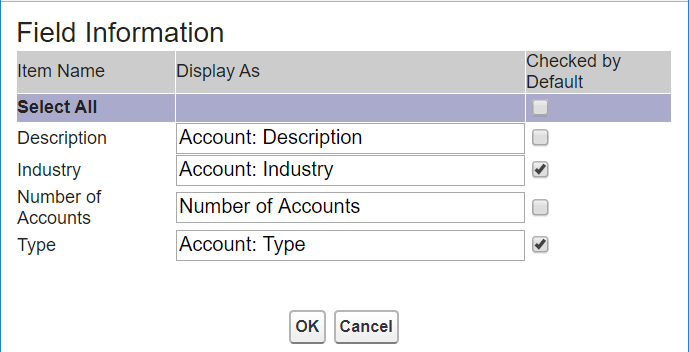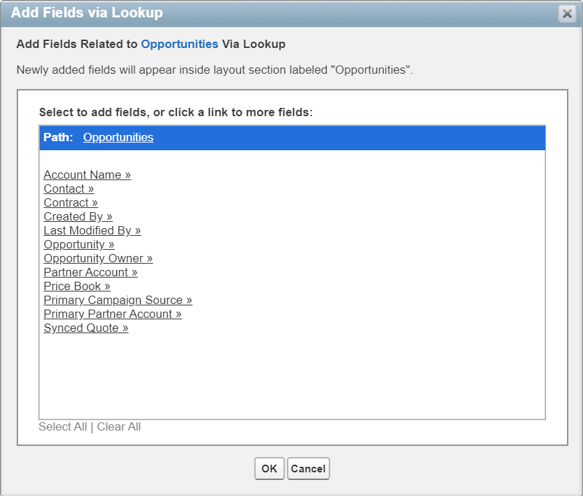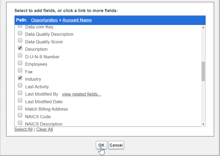Here you can check off any of the fields that exist on that object and add them to your report type layout. Be sure to only select the fields you need! You might be tempted to click “Select All”, but some of your objects likely have many fields defined that aren’t actually helpful in reports. Some may not be used by your organization. They could be standard fields or something from an installed package that’s not being utilized. Some fields might not have any data in them. Take the time to only include fields that will bring value to those running reports using this report type – the fields with rich, relevant, reliable data. The “1000 field limit” can easily be avoided by carefully curating which fields are included in this layout. Once you have selected what you need from that object, click “OK”.