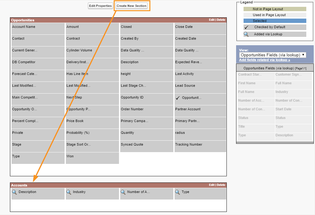 These fields will show up in the layout with a magnifying glass next to them – the “lookup” icon. This lets you know you are referencing a field from a parent object. I recommend creating a new section in your layout for each new object’s fields that you add to the layout – this helps to keep things organized as the fields will be rendered as folder groupings in the report builder user interface. You have full control to name those sections/folder groupings whatever you’d like. I tend to give some indication of what relationships are being traversed as I work further upward in the data architecture hierarchy.