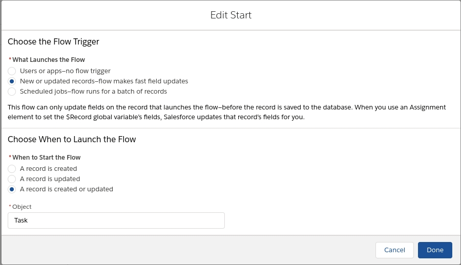 For the automation, the new before-save flow feature will work great here. Create a new flow (or use an existing autolaunched flow if you follow the “one before-save flow per object” philosophy). Choose “Autolaunched Flow” on the first screen. Double-click on the “start” element and select the “New or updated records—flow makes fast field updates” option. In the second section, choose to start the flow when a record is created or updated. For the object, select “Task” or “Event” as necessary. You may need to set up a flow for both objects if you want to replicate this solution across both kinds of activities.