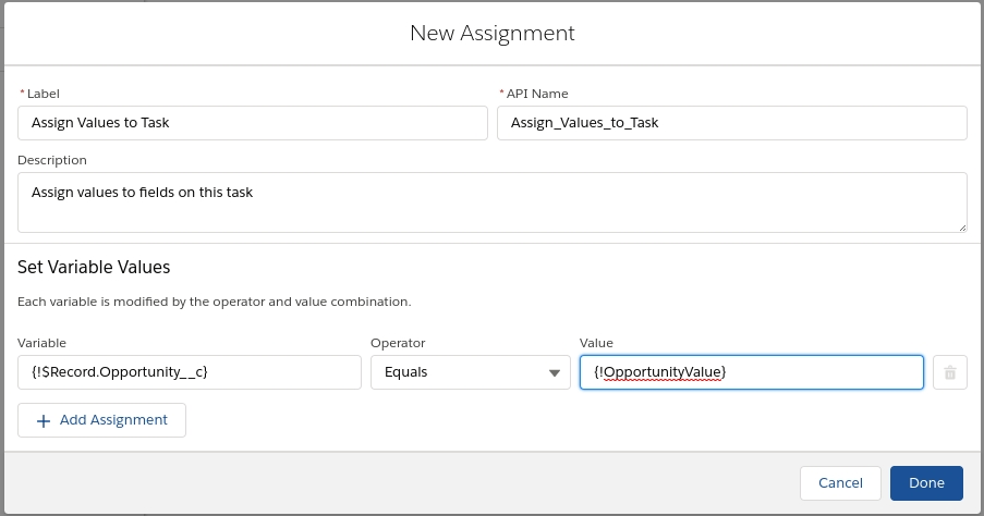 Once those settings are saved, add an assignment element to the canvas. Then set the value for the new lookup field, which we called “Opportunity” in this example, using a formula resource with the following logic: