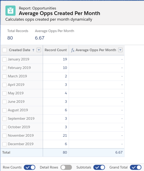 If the custom formula field created on the opportunity object was set up with the logic to count the number of months based on the created date, the summary formula in the report (named “Average Opps Per Month”) would look like this: