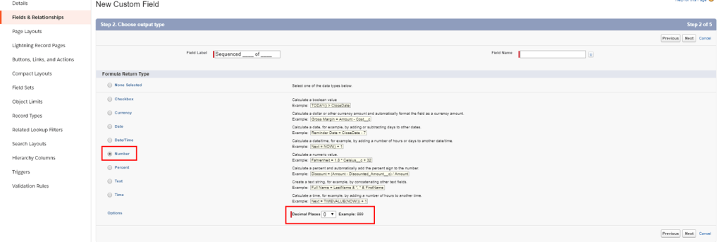 First, create a formula field on the object that has the date or date/time field in question. Select the “number” data type and enter “0” for the decimal places. For the use case mentioned at the beginning of this article, I would name this field “Sequenced Week of Created Date“. Adjust the naming convention to match the date grouping granularity and the date or date/time field used in your scenario.