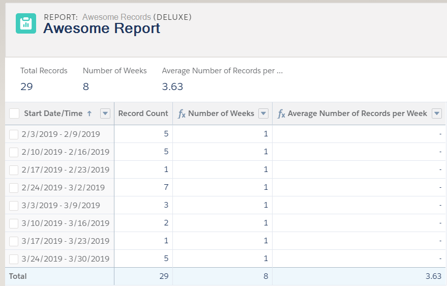 These examples use the Sunday – Saturday Week Logic for the custom formula field on the object. Then, the summary formula in the report calculates the number of records (RowCount) divided by the number of weeks shown in the report results.