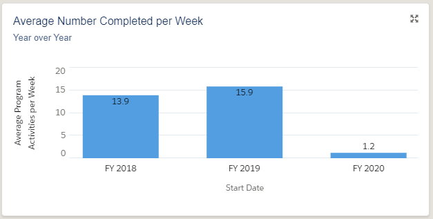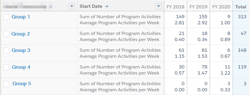 There have been 9 weeks in FY 2020 when this report was run. Group 1 had a record each week, their average per week is 1. Group 5 had a record in each of the first 3 weeks, but none after that. This calculation uses 3 as the numerator (the number of records for that group) and 9 as the denominator (which is taken from the row grand summary for that column) and results in 0.33. For the completed years, each group is getting an average calculated based on a 52-week year regardless of having records in any week of that year – as long as one of the groups has data in the first week of each year and one of the groups has data in the last week of each year.