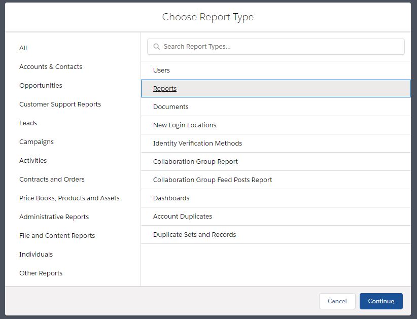 Speaking of custom report types, keeping track of these can be tedious. Often we see numerous report types that are very similar and sometimes not optimally named. We can use a report to provide insight on our custom report types. Grouping these by type can surface high level metrics. keep in mind that the type is really just what you’ve named the custom report type. By evaluating these you may see trends that allow you to combine types in order to streamline report type selection for your users. To do so we’ll need to create a custom report type that has more fields available than the standard one.