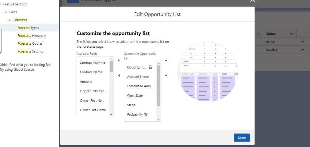 From Setup we can search for ‘Forecast Types’ and are taken to a newly improved UI. From here we can create, edit and activate or deactivate our Forecast Types. An easy to use wizard launches and allows us to quickly add new or update existing Forecast Types. From here it is quicker than ever to edit the fields displayed from the Opportunity list on the Forecast page as well. We are still limited to four active Forecast Types which are based on amount or quantity from Opportunities, Opportunity Products or Line Item Schedules. This new Forecast Type administration is available in Lightning only.