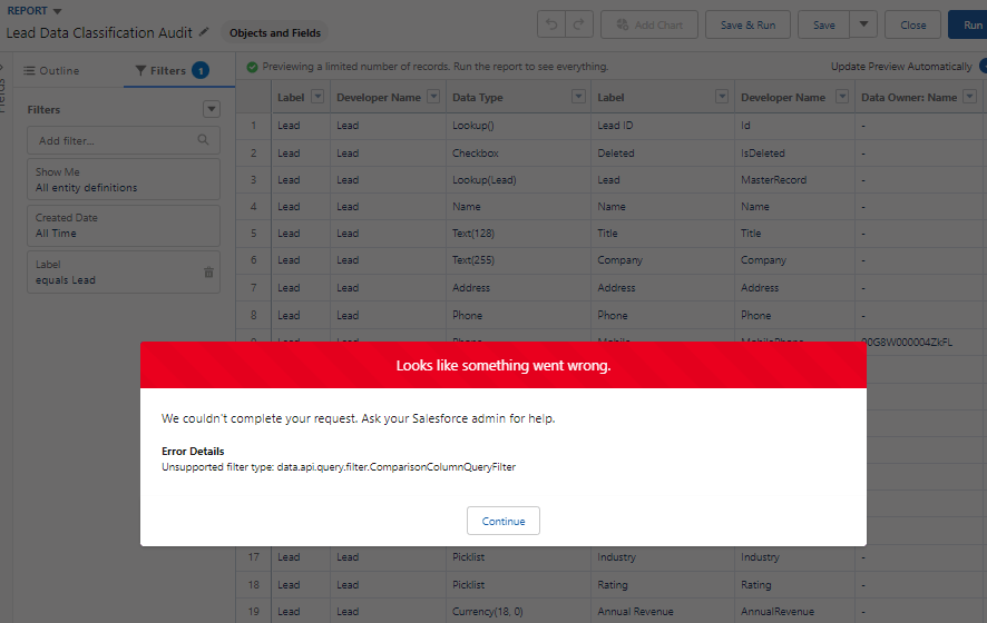 Our fields have been classified. Now imagine that the CCPA regulation has changed and we quickly need to determine what data falls into the new requirements. We can easily run a report and filter on those fields with the ‘CCPA’ Compliance Categorization value, correct? Note quite. One roadblock that we will face with this example is that the ‘Compliance Categorization’ field cannot be used as a filter with the ‘includes’ function even though that is a selectable option. This is frustrating, but there is a work around. Create a filter using the ‘equals’ function and replicate this for the possible combinations of the multi-select picklist and utilize custom filter OR logic. You can vote to have this field become supported in the ‘includes’ function filter here.