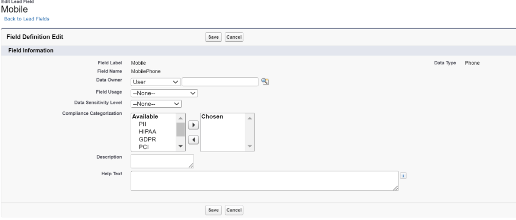 Another great use case for auditing field data classifications. These metadata items let us set important attributes on a field. Since they are fairly new the majority of the fields in your Org will not have these filled in. To determine which need to be filled in as well as identifying which may fall under certain compliance regulations we can pull reports to help us. They same report type that we used in our first example can be used here. First, we will extract those fields from the Lead object that do not have data classification set via a report export. Next, we’ll update our exported file and then update back into the Org.