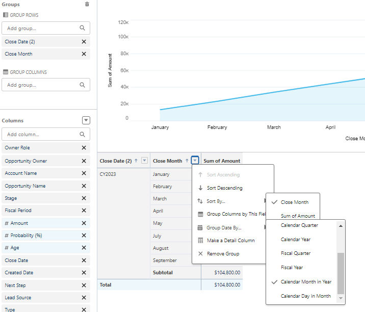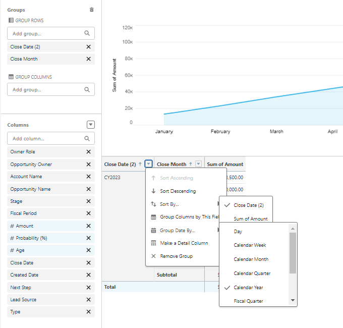 Next we will add two Groupings, one using Close Month, and the other using Close Date (2). This is an out of the box second Close Date Grouping option, nothing custom. Close Date (2) should be the first Grouping, this will display the Year by selecting Group Date by Calendar Year. Close Month will be the second Grouping, this will display the Month by selecting, Group Date by Calendar Month in Year.