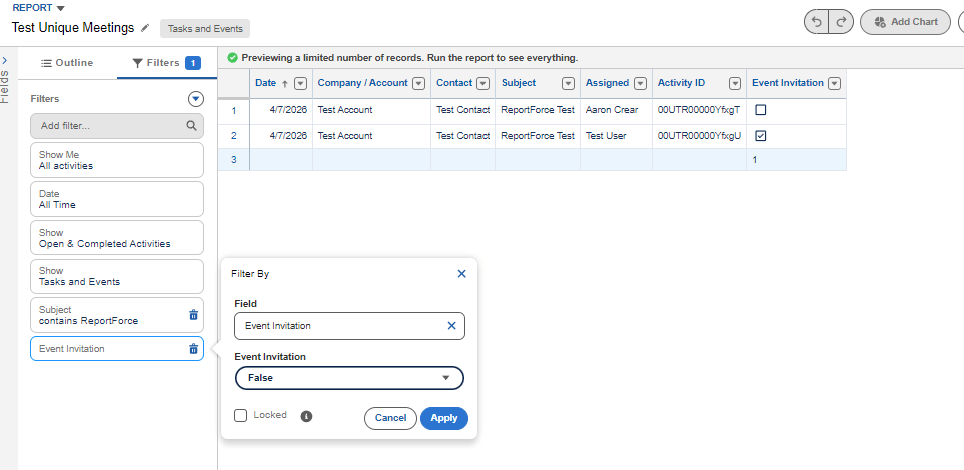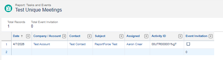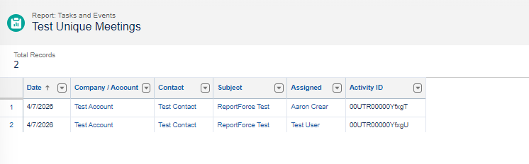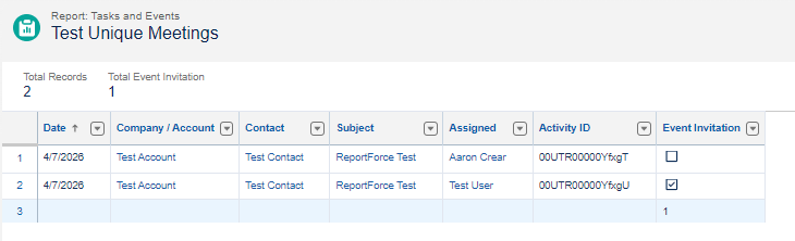 I sent a meeting invite from Outlook to Test Contact (customer) and Test User (User). The Subject was “ReportForce Test”. When I run a Tasks and Events Report I can see that there are two rows with this Subject line (filtering on Subject). I’ve added a column for Activity ID (custom formula field) just to show that these are in fact two different Event records for the same meeting. As stated above, if I was trying to count how many meeting that my team had today using this Report the total would be 2, instead of the expected 1.